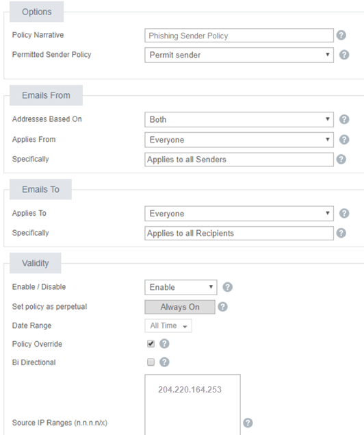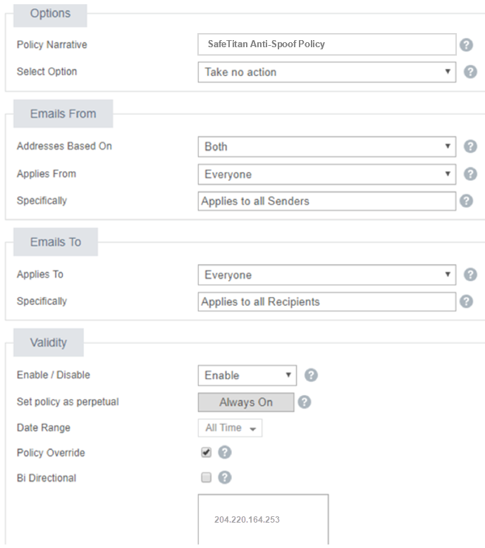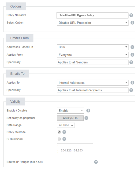 Applying the following policies should allow SafeTitan’s simulated phishing emails to arrive in the target inboxes. Emails containing attachments should also be catered for based on these policies.